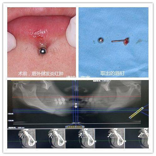 长沙19岁男孩小刘2个月前于美容机构植入下唇唇钉一颗,1个多月后开始出现疼痛不适,并且唇钉的一部分逐渐内陷。6月5日,由于唇钉无法取出,导致唇钉周围还伴有感染,小刘来到湖南省人民医院马王堆院区口腔二科求诊。